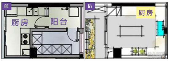 原戶型廚房太小,且有轉角、不規則,生活陽臺也比較小,于是設計師重新規劃廚房和生活陽臺功能區,首先將作用不大的雜物間并入廚房,而生活陽臺則在其他空間重新打造,改造后的廚房區域明亮寬闊、方正大氣。此處改造亦解放了原廚房的部分空間,為餐廳和客廳方正化、整體性的優化改造提供可能性。