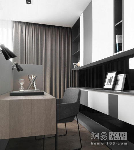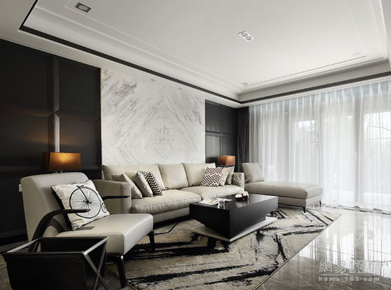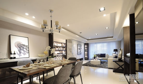 設計師為了增強設計上的效果,在客廳電視背景墻兩邊設計了隱形門,方便進出客廳旁的多功能書客房,同時也保留了客廳與陽臺之間較為隱蔽的進出口。