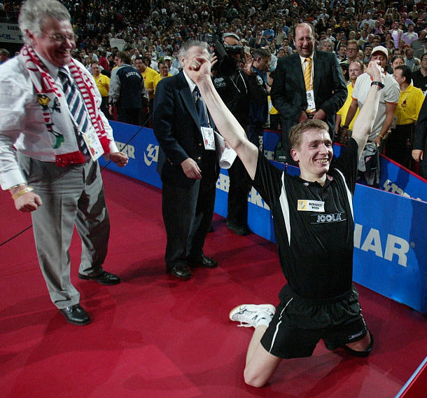 在2003年的巴黎世乒賽中,八分之一決賽,施拉格淘汰韓國(guó)名將金澤洙;四分之一決賽,施拉格打敗了中國(guó)名將王勵(lì)勤;半決賽,施拉格戰(zhàn)勝了中國(guó)名將孔令輝;決賽,施拉格力克韓國(guó)黑馬朱世赫獲得了世乒賽男單冠軍!幾輪比賽下來(lái),施拉格成了西方乒乓球界的大救星。四個(gè)東方人,全部倒在了施拉格拍下。
