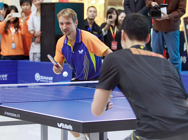 施拉格,歐洲環(huán)保形象大使、奧地利國(guó)寶級(jí)運(yùn)動(dòng)員。時(shí)年四十五的施拉格征戰(zhàn)球場(chǎng)多年,擅長(zhǎng)守中反攻打法,他常常在被動(dòng)防守狀態(tài)突然用一板回頭球打?qū)κ謧€(gè)措手不及,再加上極具迷惑性的半高拋發(fā)球,使得施拉格成為了上世紀(jì)90年代末期國(guó)際乒壇極具實(shí)力的歐洲選手。