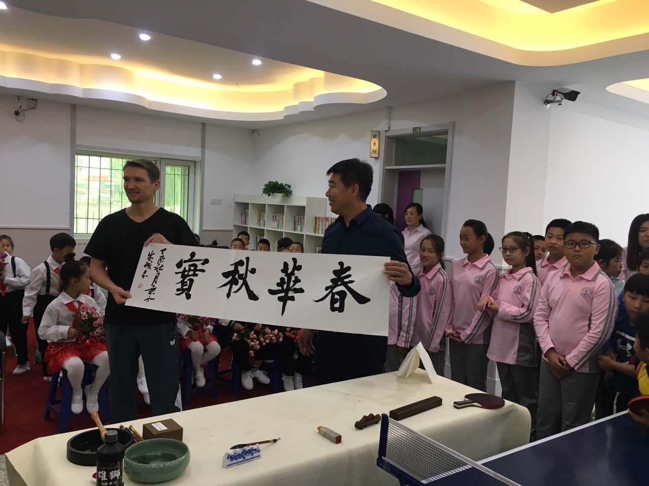 隨后,區(qū)委宣傳部常務(wù)副部長牛成也展現(xiàn)了中國書法的魅力,親手書寫“春華秋實”贈與施拉格,促進中奧兩國的文化交流。而施拉格也回贈親筆簽名的冠軍球拍給船營四小的同學(xué)們,以此紀(jì)念此次意義非凡的校園交流活動。