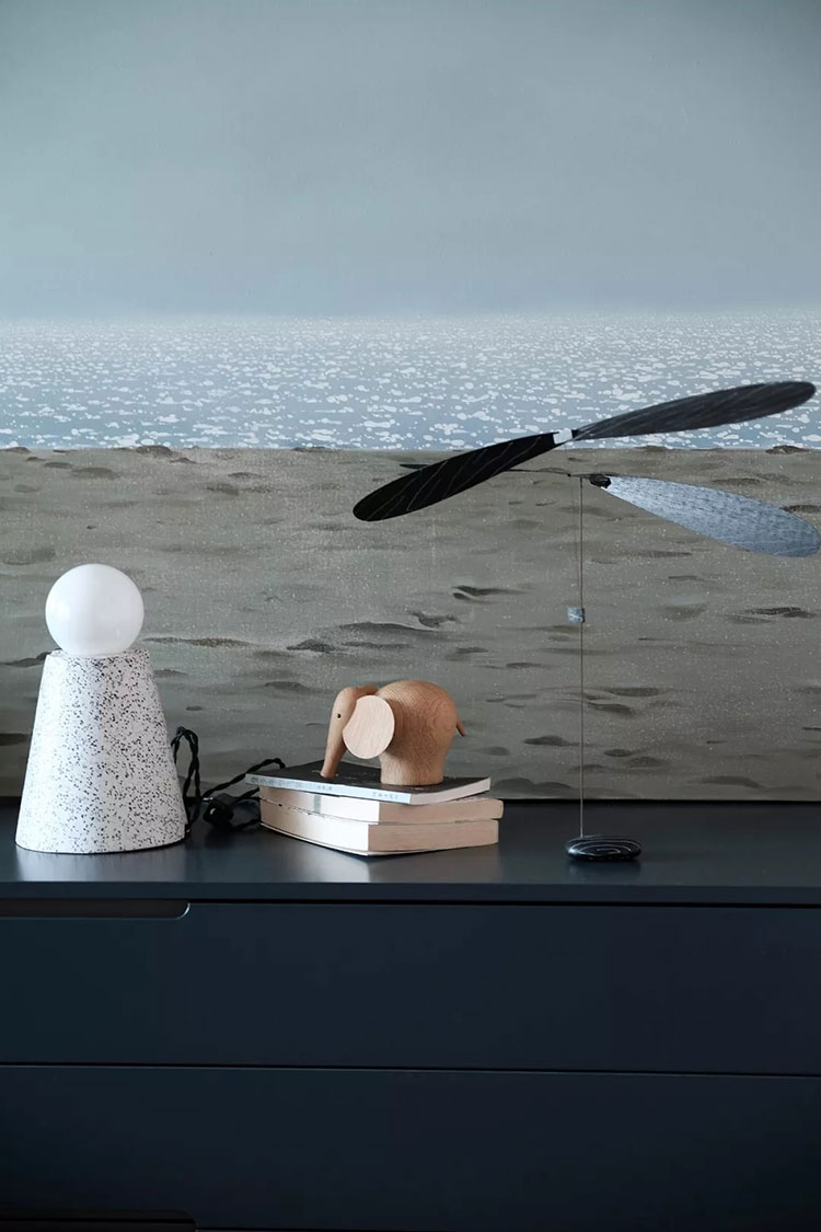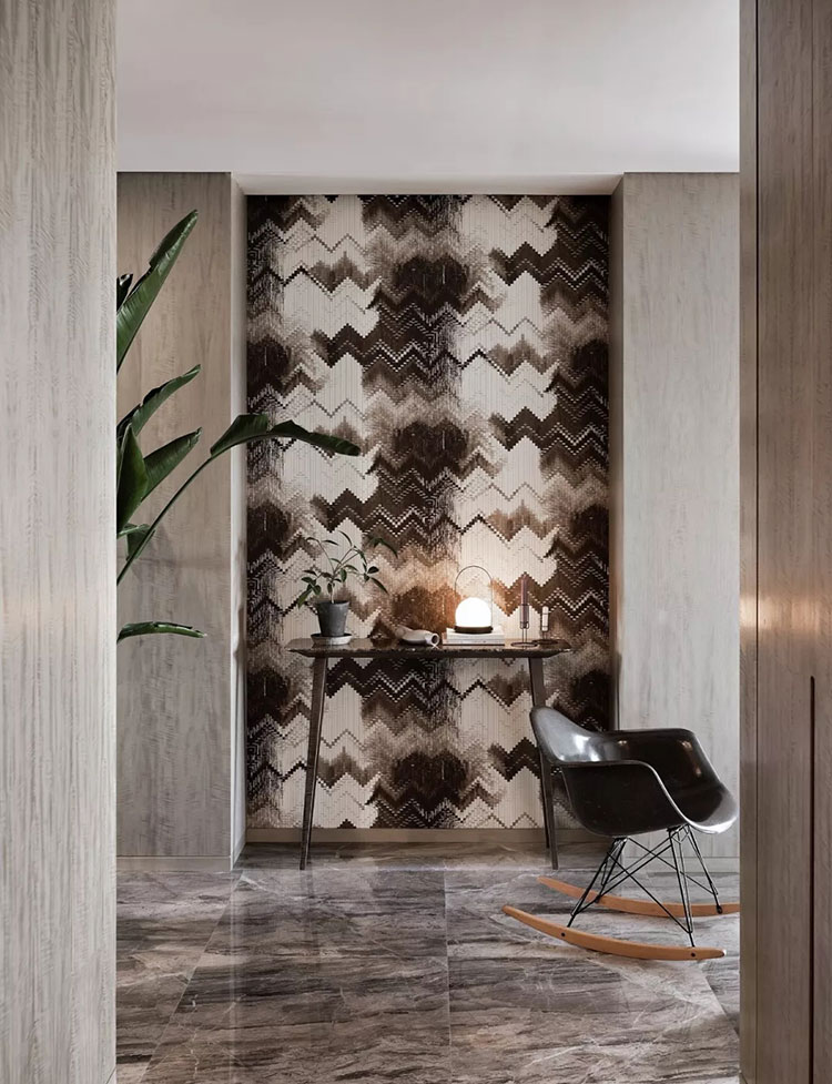 一樓,踏入玄關,一幅波紋狀的灰白色背景墻布搶占視覺先機,復古別致的手提燈和清新的綠植為家增添第一抹溫暖的氣息。Charles & Ray Eames設計的經典搖椅讓玄關多了一點動感。以玄關為界,左邊作為餐廳,右邊作為客廳。