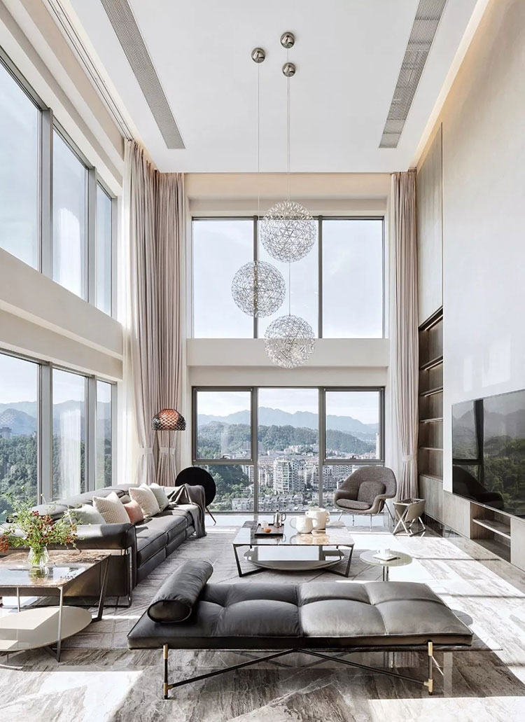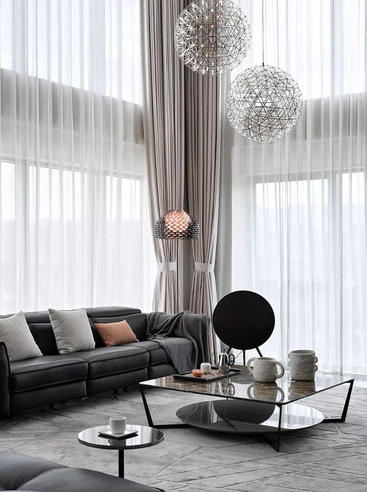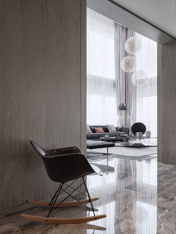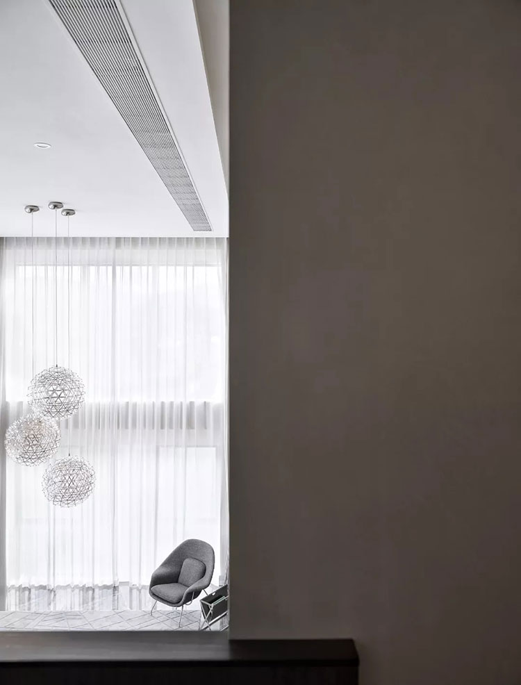 進入客廳,首先吸引人定是那足夠的層高,得益于這樣的設計,自然光線可以在電動窗簾開啟后充分進入客廳。窗外是一幅自然山水畫,窗內是溫暖精致的家。客廳主打雅灰色調,設計師將混搭型的家具有序地組合在一起,充分發揮其本來的功能,讓人們慢下來,去享受其所帶來的愉悅。