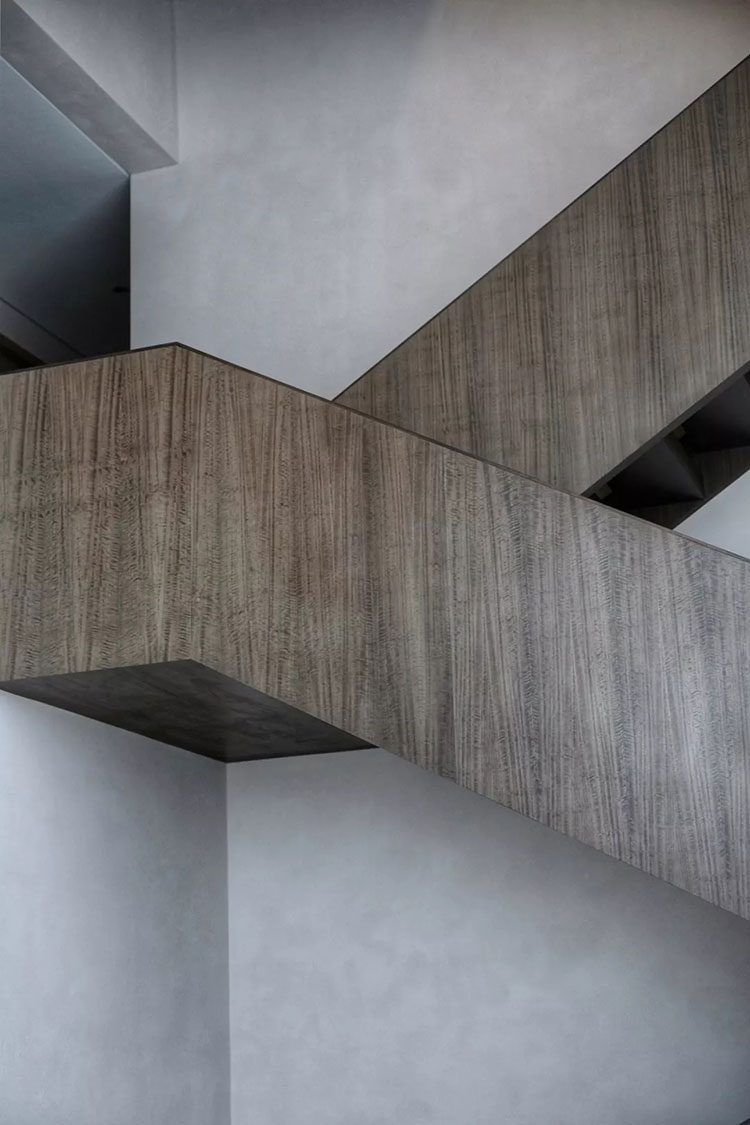 設計有時就是需要簡練、嚴謹、優雅的克制,在本案中,這種克制充分體現在了樓梯中。客廳的樓梯一直通到樓頂,灰色優雅的板材,一張藍色的裝飾椅,設計師用建筑的思維非常克制、冷靜地來表達內心想要的東西,讓樓梯在滿足功能的同時又能變成一件藝術裝置。