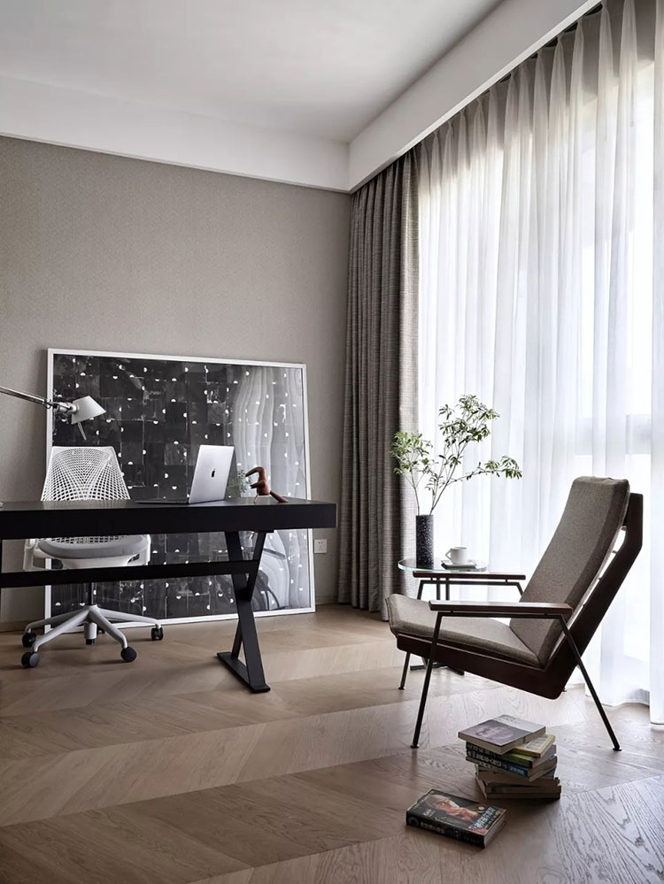 從樓梯拾級而上,二樓的書房里,一把荷蘭的中古單椅,一張小茶幾,滿鋪的必美史迪萊克軒尼詩魚骨拼地板,柔和的色調,充滿安逸氣息,打造出靜謐又舒適的私人角落。
