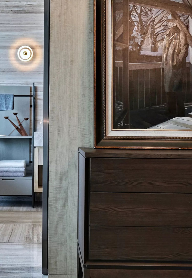 主人好酒,所以過道處的紅酒柜是餐廳一道亮麗的風景,拓寬了生活情感的維度。在不大的餐廳空間中,設計師整體采用溫潤的茶湯色設計,配畫和擺件運用了莫蘭迪色系,增加了一種高級的藝術氛圍,讓主人在用餐的同時去感受藝術之美。