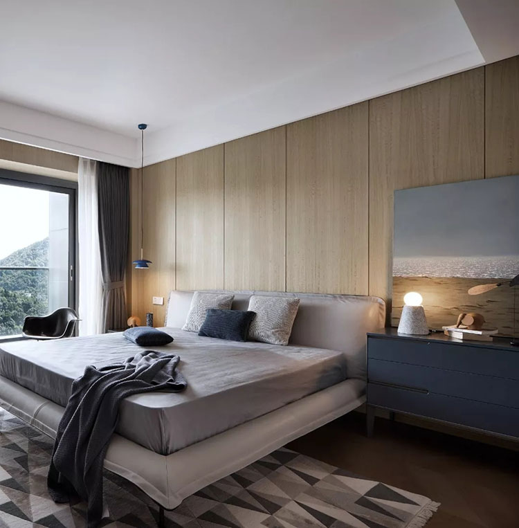 設計師很好地把握住了對家的理解尺度,這在主臥中有充分的體現。進入主臥,右手邊的陳列柜上放置著威士忌,可以看出主人不俗的生活情趣。臥室最中心的床,背景采用灰色木飾面與深藍色硬包,再配上藍色抱枕,隨意的一條披毯,不喧嘩不造作,讓人瞬間安靜下來。